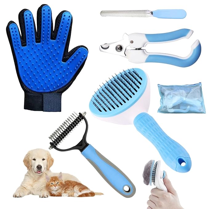 - 🐾 [Various Dematting & Nail-Care Tools] The dog brush kit boasts an array of dematting and nail care to cater to all pet's needs. 𝟭. The upgraded grooming glove offers a comfortable massage during the shower. 𝟮. The self-cleaning slicker brush can gently remove loose hair. 𝟯.The double-edged de-matting rake minimizes shedding. 𝟰. The sharpened pet nail clipper ensures quick and safe nail trimming. 𝟱. The nail polish stick can round off your pet's nails, preventing accidental scratches.