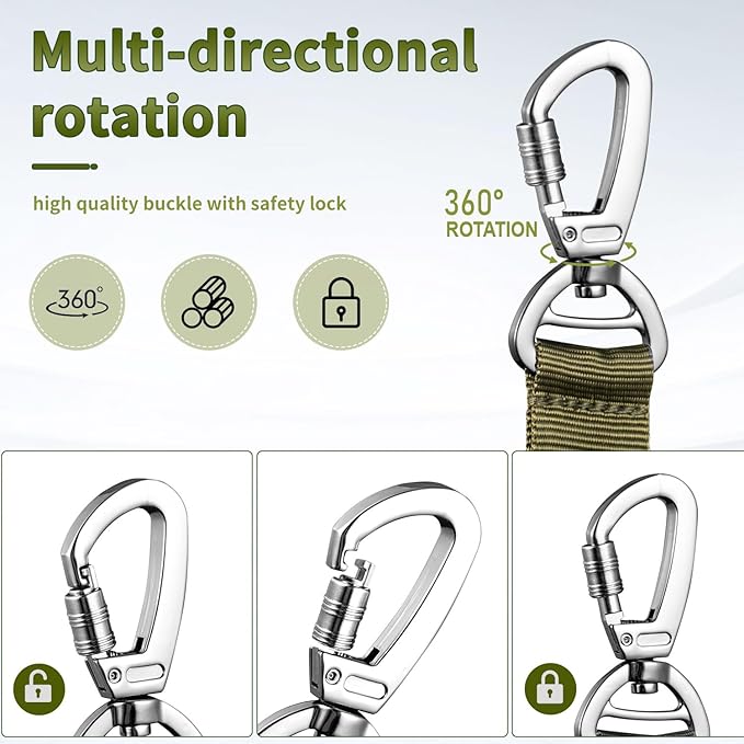 - Sturdy Metal Clasp: This tactical dog leash with 360° rotating locking clasp, it can be attached to dog vest or collar. The sturdy metal clasp is safe and secure. It will ensures the leash tangle-free and prevent accidental detachment, ensuring the safety of you and your dog.