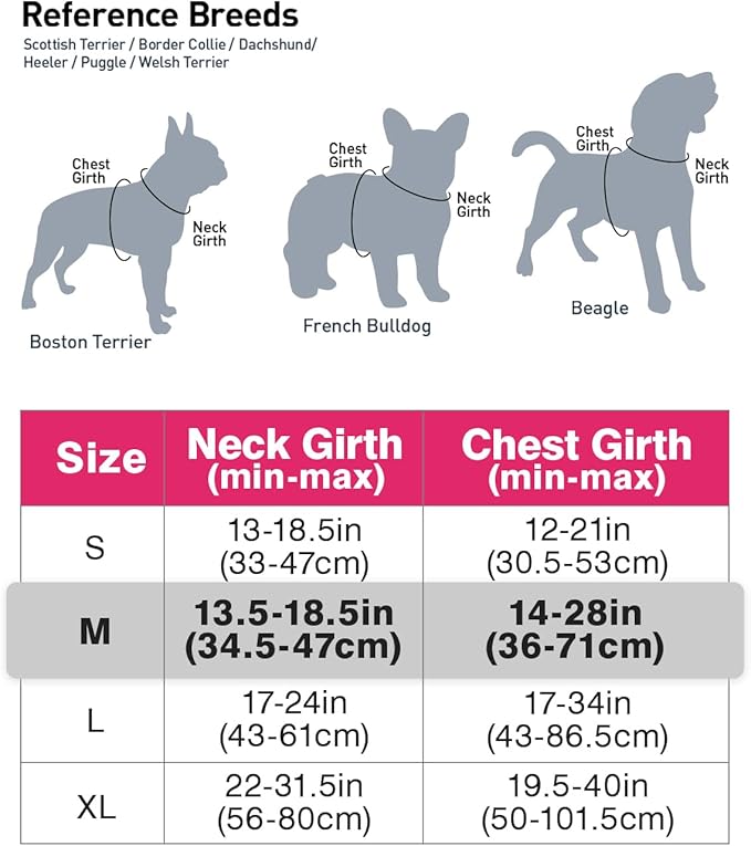 - Recommended Breeds: Medium size dogs - Chest Girth: 14"-28" / Neck Girth: 13.5"-18.5", such as French Bulldog, Beagle, Boston Terrier, Scottish Terrier, Border Collie, Dachshund, Heeler
