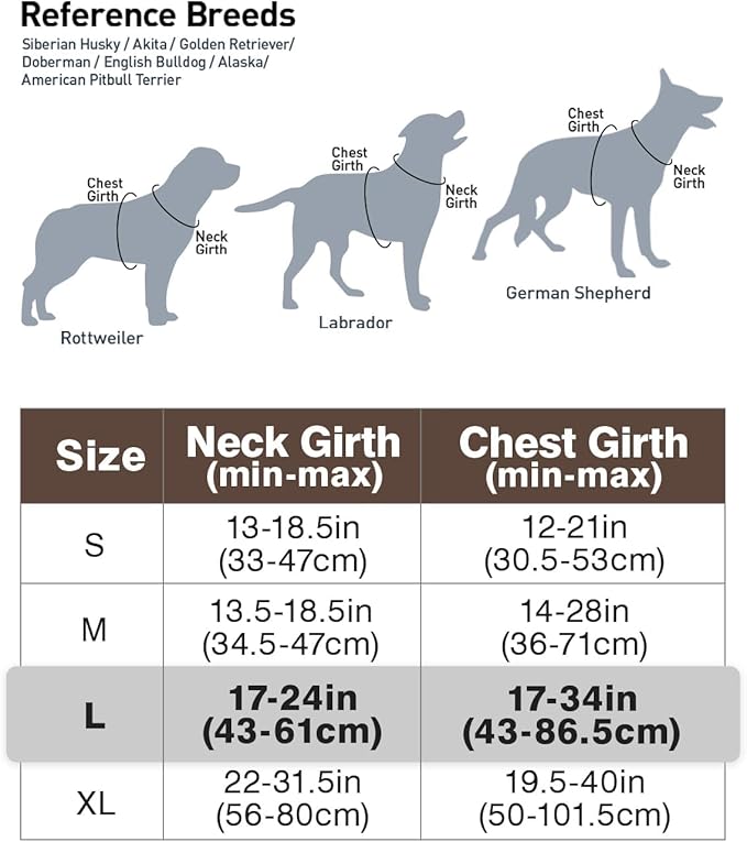 - Recommended Breeds: Large & Extra Large size dogs - Chest Girth: 19.5"-40" / Neck Girth: 22"-31.5", such as Saint Bernard, Bull Mastiff, Newfoundland, Labrador, Great Dane, German Shepherd, Alaska, Akita, Golden Retriever, Leonberger
