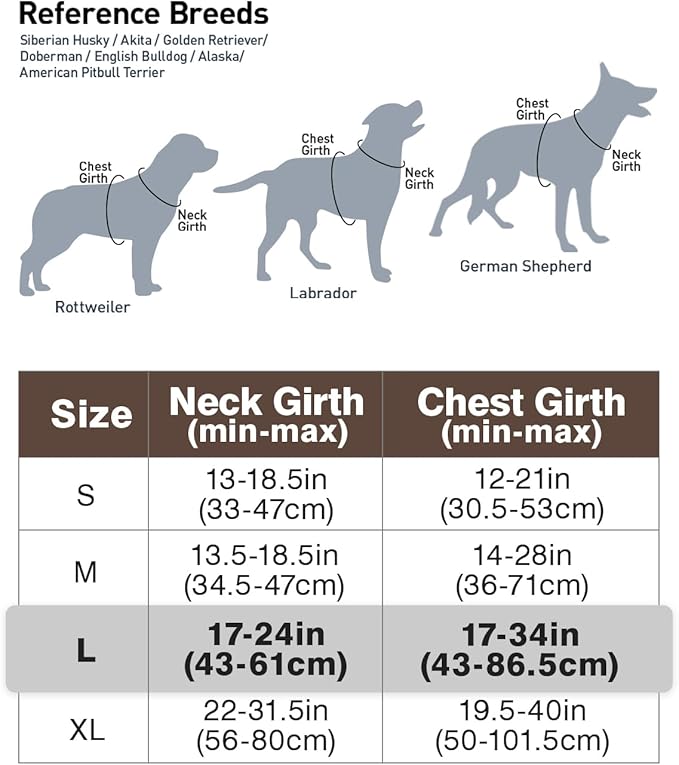 - Recommended Breeds: Medium to Large size dogs - Chest Girth: 17"-34" / Neck Girth: 17"-24", such as Labrador, German Shepherd, Alaska, Rottweiler, Akita, Husky, Golden Retriever, Doberman, Pitbull Terrier