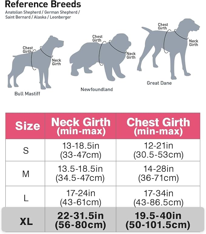 - Recommended Breeds: Large & Extra Large size dogs - Chest Girth: 19.5"-40" / Neck Girth: 22"-31.5", such as Saint Bernard, Bull Mastiff, Newfoundland, Labrador, Great Dane, German Shepherd, Alaska, Akita, Golden Retriever, Leonberger