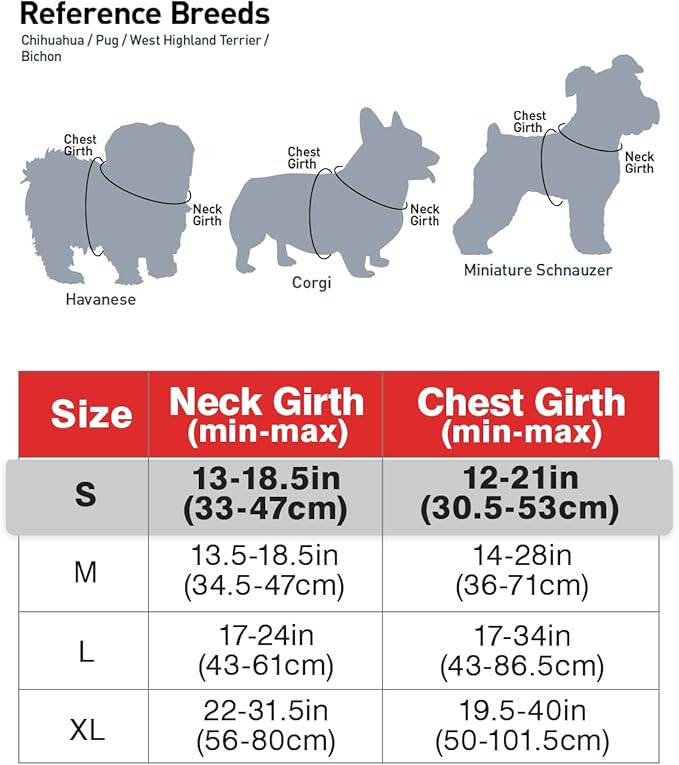 - Recommended Breeds: Small size dogs - Chest Girth:12"-21" / Neck Girth: 13"-18.5", such as Miniature Schnauzer, Pug, Chihuahua, Corgi, Havanese, Bichon, West Highland Terrier