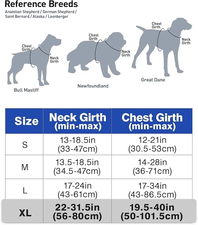 - Recommended Breeds: Large & Extra Large size dogs - Chest Girth: 19.5"-40" / Neck Girth: 22"-31.5", such as Saint Bernard, Bull Mastiff, Newfoundland, Labrador, Great Dane, German Shepherd, Alaska, Akita, Golden Retriever, Leonberger