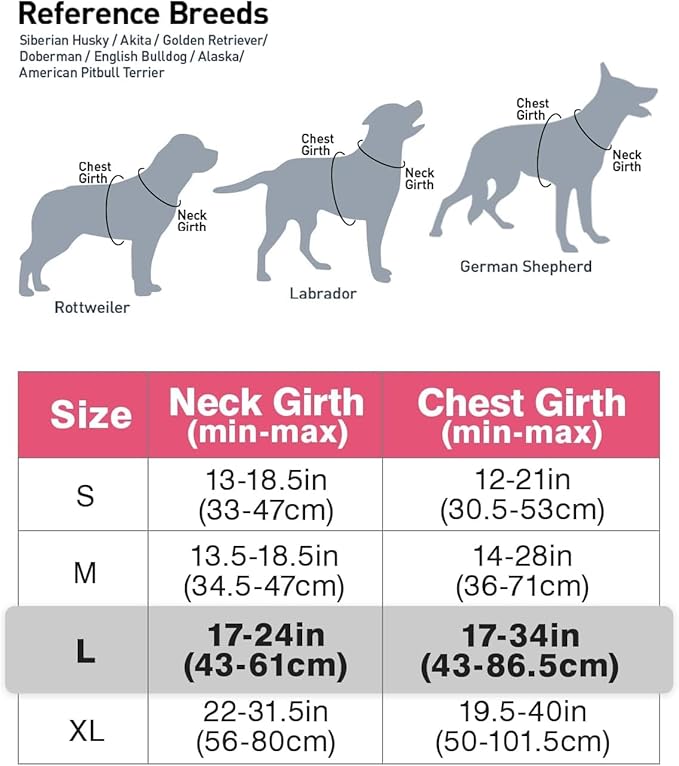 - Recommended Breeds: Medium to Large size dogs - Chest Girth: 17"-34" / Neck Girth: 17"-24", such as Labrador, German Shepherd, Alaska, Rottweiler, Akita, Husky, Golden Retriever, Doberman, Pitbull Terrier