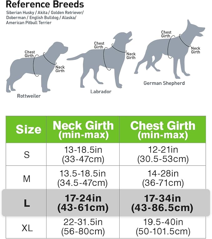 - Recommended Breeds: Medium to Large size dogs - Chest Girth: 17"-34" / Neck Girth: 17"-24", such as Labrador, German Shepherd, Alaska, Rottweiler, Akita, Husky, Golden Retriever, Doberman, Pitbull Terrier