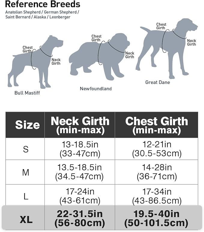 - Recommended Breeds: Large & Extra Large size dogs - Chest Girth: 19.5"-40" / Neck Girth: 22"-31.5", such as Saint Bernard, Bull Mastiff, Newfoundland, Labrador, Great Dane, German Shepherd, Alaska, Akita, Golden Retriever, Leonberger