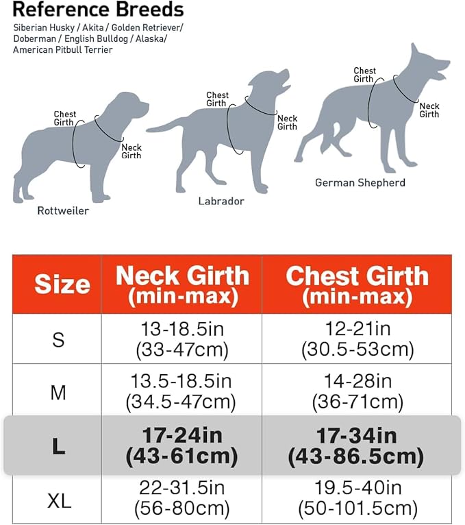 - Recommended Breeds: Medium to Large size dogs - Chest Girth: 17"-34" / Neck Girth: 17"-24", such as Labrador, German Shepherd, Alaska, Rottweiler, Akita, Husky, Golden Retriever, Doberman, Pitbull Terrier