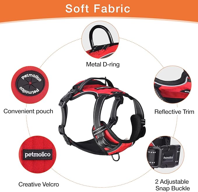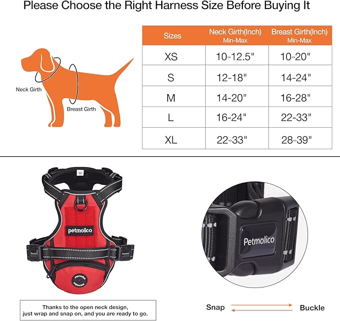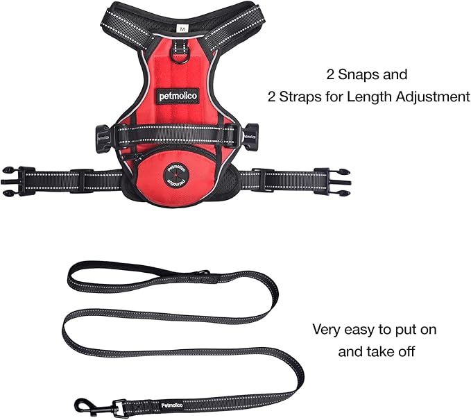 - [ Easy-On and Off ] Petmolic no pull dog harness has 2 buckle closures on each side of vest tail for easily put on and take off. traps on each side of the chest can be adjusted in length to fit your dog's chest size. It may take a while to adjust for the first time, but once it's adjusted, it's fairly easy to put on. And easy to take off by releasing two buckles.