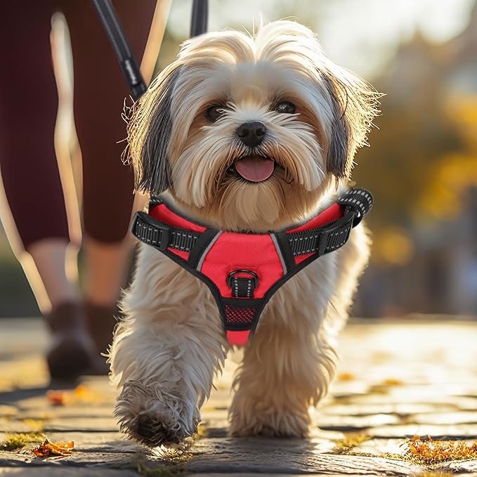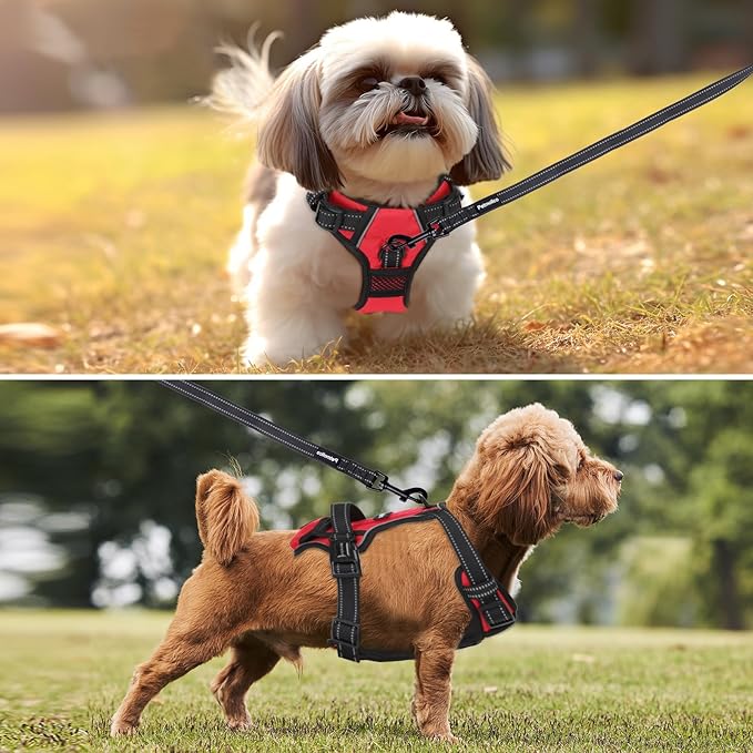 - [ Adjustable and Reflective ] The easy-on harness has 4 adjustable points, which create a secure fit. And slip-resistant straps mean the buckles will stay put after adjusting. The reflective strips on the harness making your dog more visible and the two of you safer during walks at night. The breathable material also won't trap heat, making it a great choice for both winter and summer walking, running, hiking. Plus Velcro on the back for attaching whatever you want.