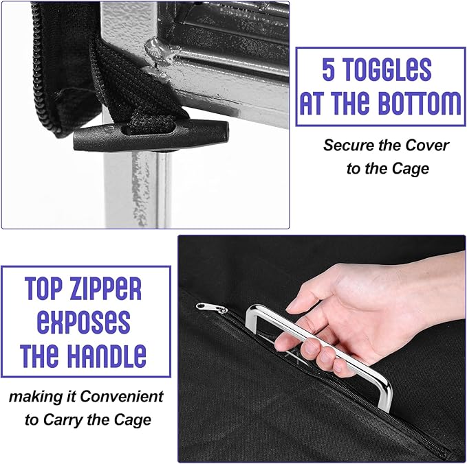 - 【Toggles & Top Zipper】Total 5 elastic toggles at the bottom of corners, easily attach the 42 inch dog crate cover to the dog cage. Avoid scaring your pet dog due to the fluttering of the cover, so he / she will enjoy a quiet and secure bedroom. If you want to move the position of the medium dog crate cover, unzip the top zip to reveal the carrying handle and you can easily lift the cover for dog crate without taking the large dog crate cover off and move it.