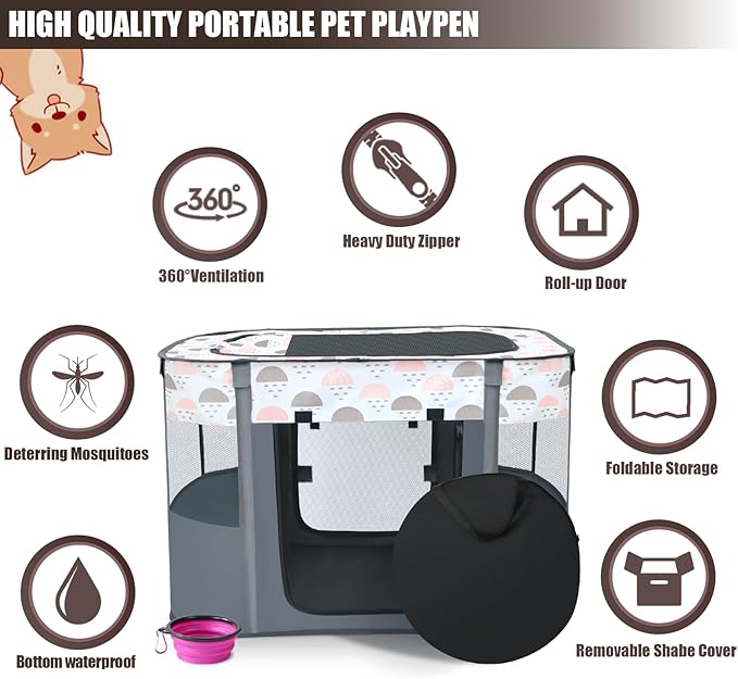 Portable Foldable Pet Playpen with Carrying Case and Travel Pet Bowl, Water Resistant Dog Cat Playpen Crate with Removable Shade Cover, Puppy and Kitten Indoor/Outdoor Pop Up Playpen(S)
