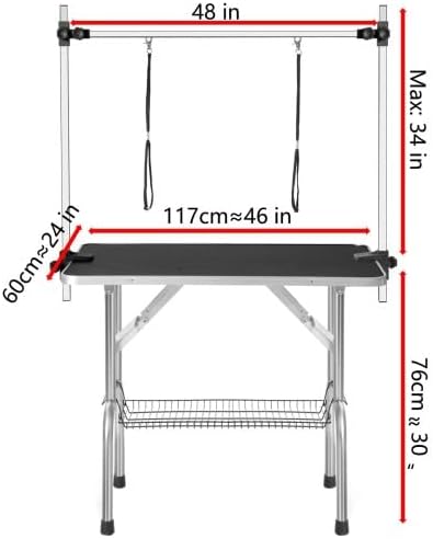 - 【Height Adjustment Trimming Table】Height adjustable H-frame with two nooses for varied needs. The grooming table contains with 8 tension knobs for willingly arm height adjustment.Height of the Adjustable Arm: 89.5CM