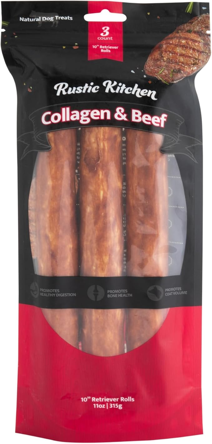 Rustic Kitchen Real Beef Collagen Sticks for Dogs, Collagen Retriever Roll 10" - 3ct, Dog Chews Long Lasting, Rawhide Free for All Dog Breeds