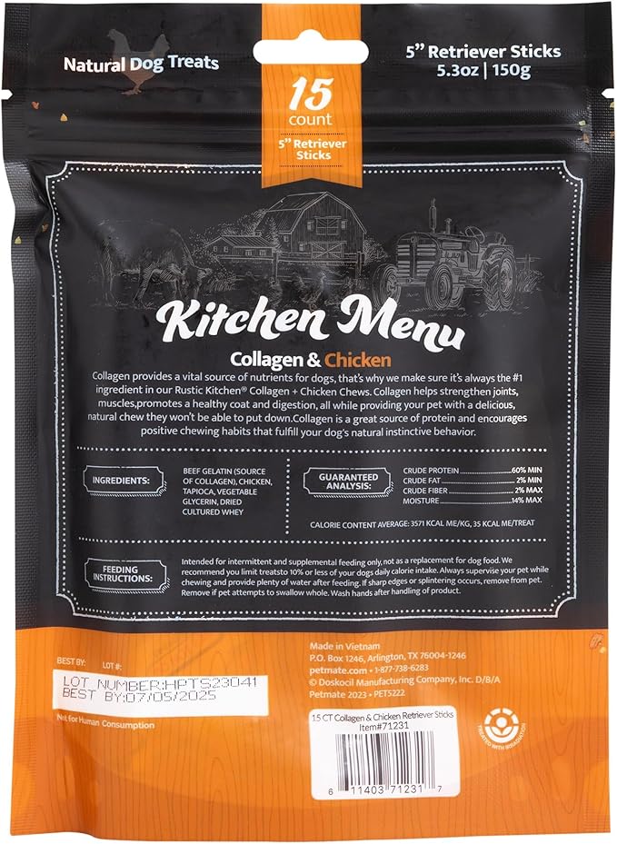 Collagen Chews for Dogs, Real Chicken, Dog Chews Long Lasting, Rawhide Free -15 Pack Collagen Sticks for Large, Medium, and Small Dogs