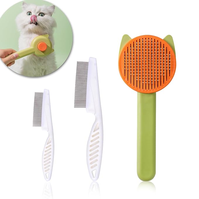 Pet Grooming Brush Kit for Cat and Dog, Hair Massage Cleaner with Release Button, 2 Flea Combs for Shedding Removing Tangles Loose Fur Self Cleaning Accessories, Green(3 Pieces Set)