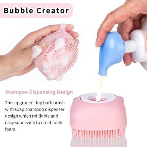 - 【 Multifuntional Dog Bath Brush】The dog shampoo dispenser brush has many functions to help save shampoo at your pet's bath time, provides a quick and gentle wash, helps remove long and short hair from your pet and dirt from your dog and cat, in addition to massage for your dog and cat's skin, this dog bath brush solves your pet's bathing, hair removal, massage and grooming problems, making your pet fall in love with bathing thanks to the pet grooming brush.