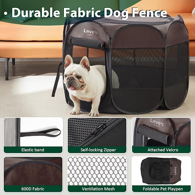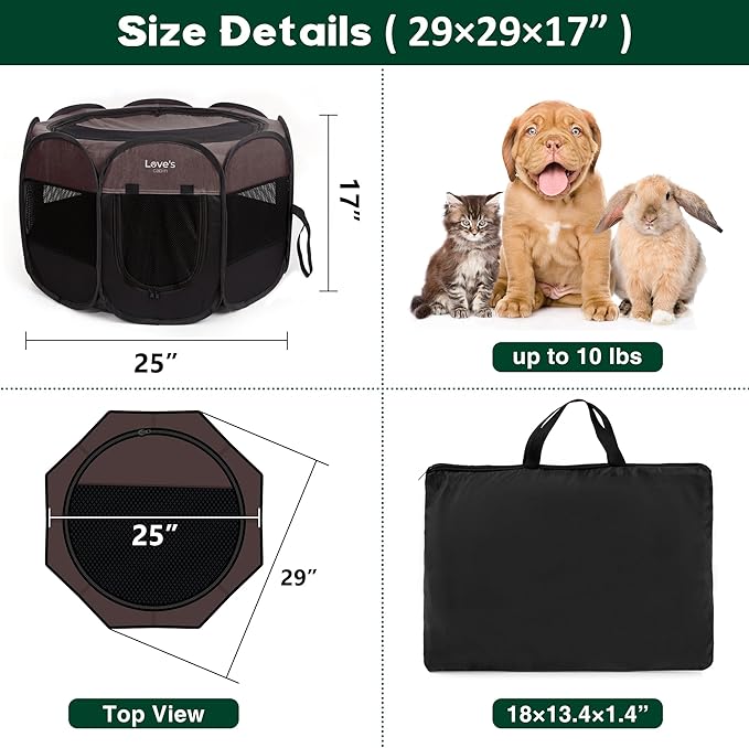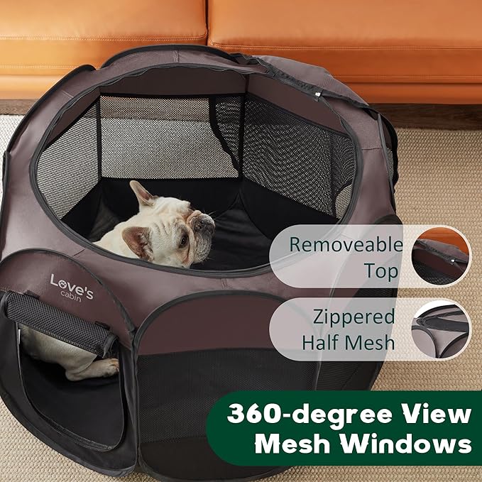 Love's Cabin Pet Puppy Playpen, Small Dog Tent Crate, Portable Foldable Dog Kennel with Carrying Case, Removable Zipper Top, Brown