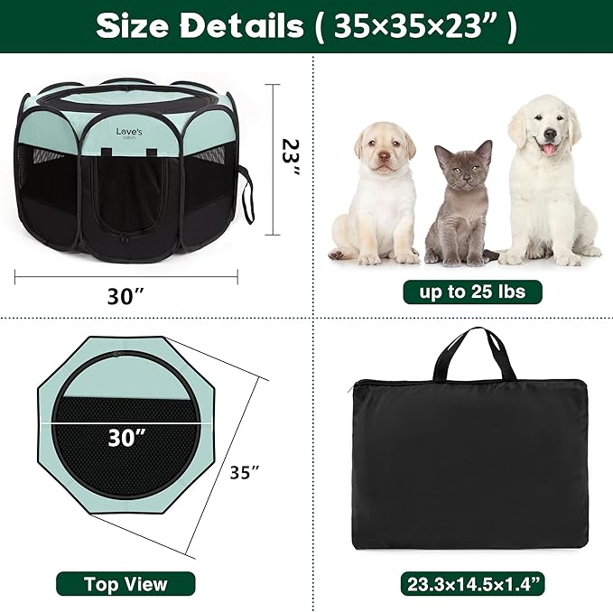 Love's Cabin Pet Puppy Playpen, Medium Dog Tent Crate, Portable Foldable Pop Up Dog Kennel with Carrying Case, Removable Zipper Top, Green