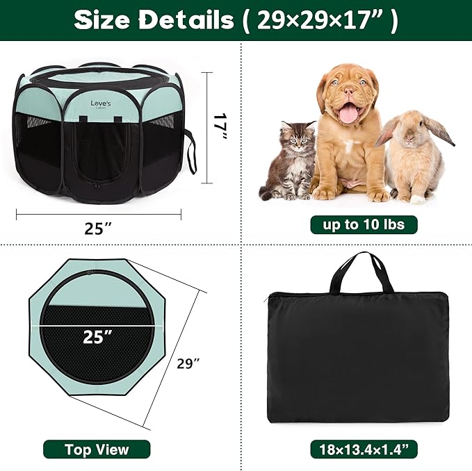 Love's Cabin Pet Puppy Playpen, Small Dog Tent Crate, Portable Foldable Dog Kennel with Carrying Case, Removable Zipper Top, Green