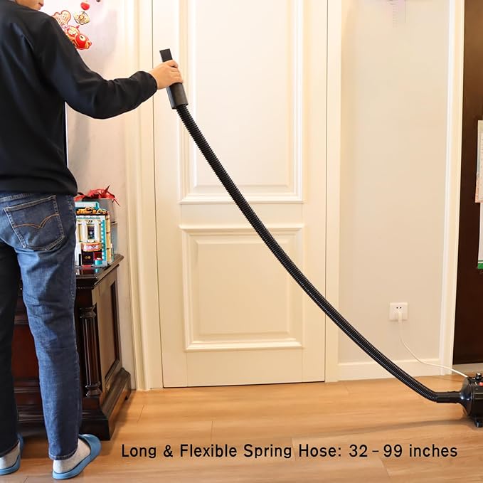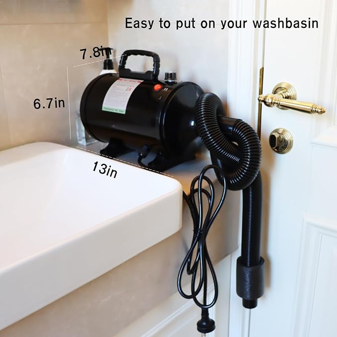 - Flexible Spring Hose: 32-99 inches, flexible hose easy to reach around the pet especcially their face and ear . A handle on the end makes it comfortable to hold and your hand doesn't get warm. Keep the hair blower away from the motor and only bring the hose/tube close to the dog especiaaly for ears and face dry which different from using a conventional hairdryer that may gets super loud and bothers your pet.