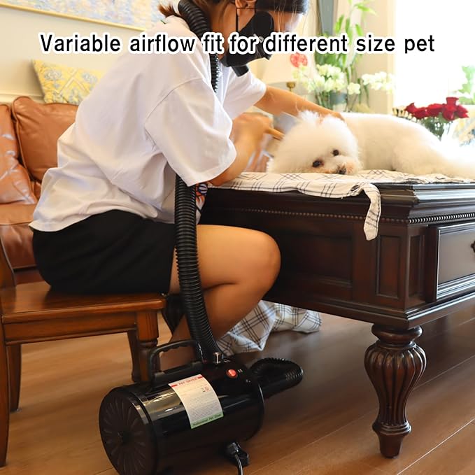 - Variable airflow fit for different size pet: 30-90M/s, control the wind the dryer blow out by youself based on your pet size & fur. Started with the lowest air setting then turn it up a bit step by step, you can watch the mist of water being blown out of his hair then adjust the airflow. The sound is moderate loud but not ear crushing loud. Adjustable settings make it easy to choose different levels of drying for different types of coats, and fits for kitten cats to large dogs.