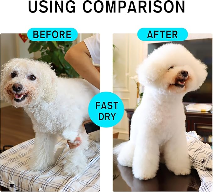- Fast blow-drying & blow dust off and loose hair in a short time: 2800W adjustable / Voltage 110/120V. Powerful, dry your pet's fur fastly than using towel alone or your hair dryer after bath and remove the little tangles in their undercoats, help to blow off the dust and muddy especillay after they back from your yard everyday. Quickly and efficiently dries pet's coat, keep it soft, fluffy and shiny. You can groomed your pet entirely at home and save time if the the groomer is far away.