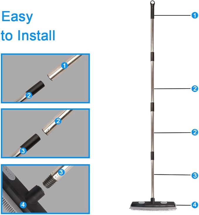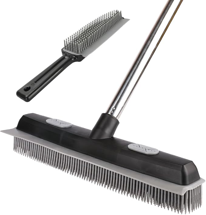 Pet Hair Rubber Broom with Carpet Rake and Pet Brush, 2 in 1 Floor Brush for Carpet, 62 inch Adjustable Handle
