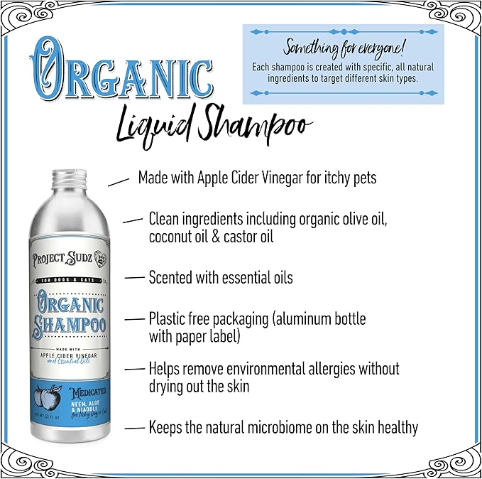 - APPLE CIDER VINEGAR - We use ACV as a base for our liquid shampoo Its nutrients make it a great dog shampoo.