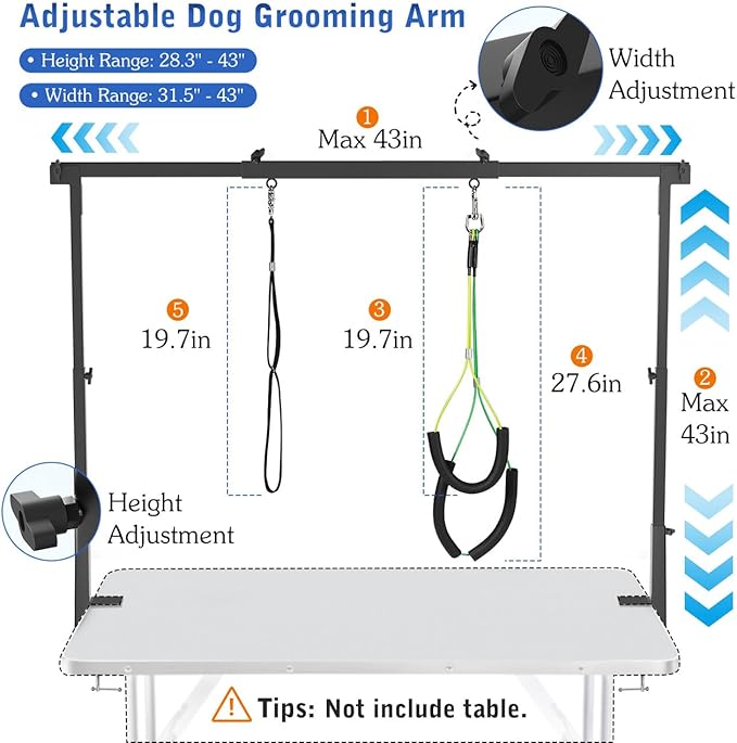 - Adjustable Dog Grooming Arm: The dog grooming table arm can be adjusted in height and width with dog size by screws, the height up to 43 inches and the width up to 43 inches. The table clamp can hold 1-5.5cm/0.4-2.2'' wood and marble tables, suitable for large dogs or multi-dog families.