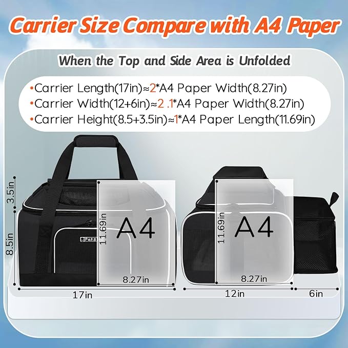 - 【AIRLINE APPROVED CARRIER 】Unfolded size:17"L×(12+5)"W×(8.5+3.5)"H, Petskd pet carrier is TSA approved and can be placed under the seat in the cabin, it is mainly designed for ①JetBlue Airlines:17x12.5x8.5"②Spirit Airlines:18x14x9"③Frontier Airlines:18x14x8", but also in compliance with ④Allegiant Airlines:19x16x9"⑤Southwest Airlines:18.5x13.5x9.5"⑥Air Canada:21.5x15.5x10.5". We recommend you buy this carrier when you fly with the above-mentioned airlines. When you take the carrier on airplane, please fold the top and side expansion areas for the size of airline seat.