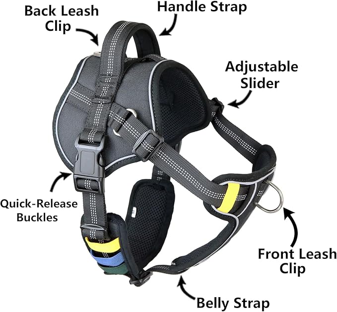 - 【Superior Control Performance】: Enjoy versatility with two leash attachment options. The front clip design is best way to anti pull and helps with training, while the back attachment is ideal for leisurely strolls and casual outings. Choose the attachment point that suits your specific needs and enjoy enhanced control every step of the way. This dog harness equipped with handle on the back, providing with instant grip control to prevent potential dangers.