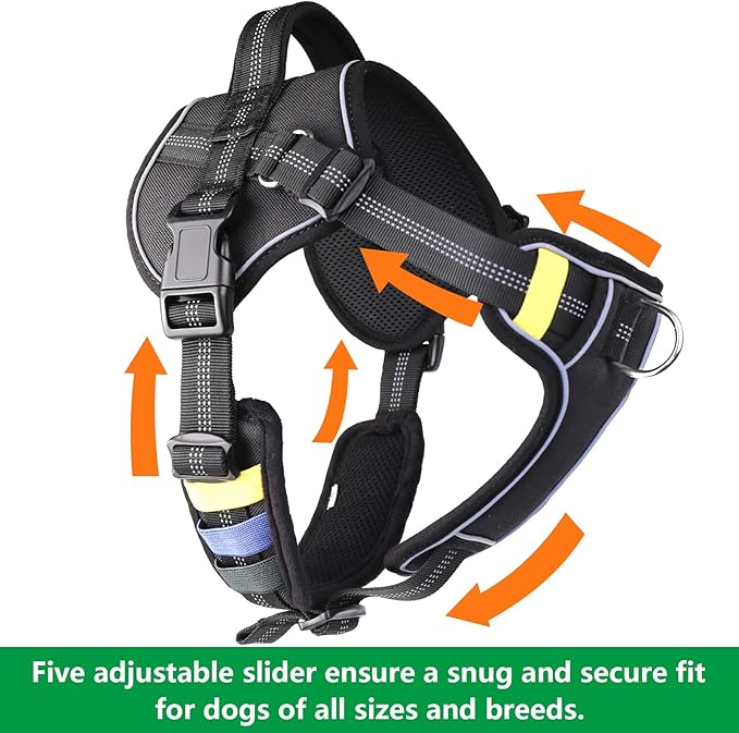 - 【Easy to Use and Adjust】: Our harness is designed for hassle-free usability. The quick-release buckles make it effortless to put on and take off, saving you valuable time. This escape proof dog harness is built with Five adjustable slider, allowing for a customized fit, ensuring a snug and secure harness for dogs of all sizes and breeds.