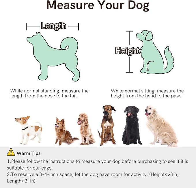 - 【Choose the Right Size】The internal dimensions of the wooden dog crate furniture are 34.6"Lx21.6"Wx26.4"H, perfect for small to medium dogs (weight: under 70 lbs; L: <31"; H: <23"), such as Border Collies, Shiba Inus, Bulldogs, and so on. Please measure your dog's size before purchase to make sure it fits your dog. Any question please let us know any time.