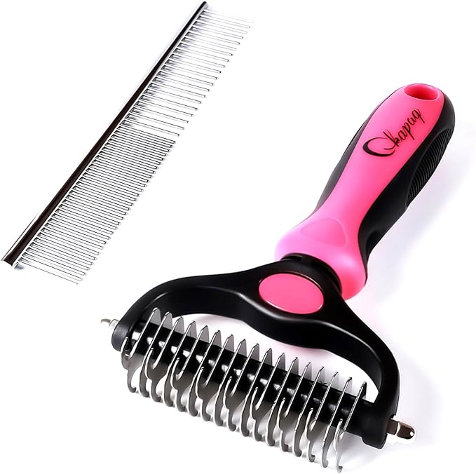 - DESIGN OF DOG DECOATING TOOL】: High quality stainless steel metal teeth and compact design make our product sturdy and durable. High quality and lightweight TPR handle provides a comfortable non-slip grip and allows you to enjoy grooming your dog's hair. Double coated high quality combing shedding dog comb, dog rake, cat brush, matte coat comb for dogs.
