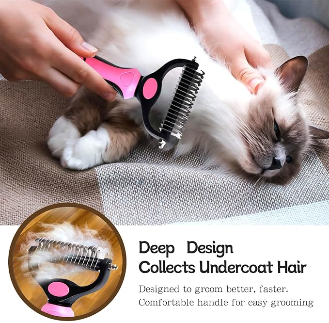 - [SKIN-FRIENDLY DESIGN]:The soft rounded edges of cat de-shedding combs and cat combs create a massaging effect when brushing, combing through tangled hair and removing hair without scratching or irritating your pet. This dog hair brush is suitable for long-haired pet de-shedding, cat hair brush, double bottom rake dog hair brush for dogs.