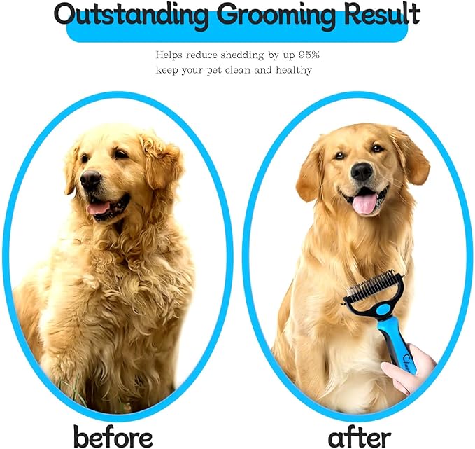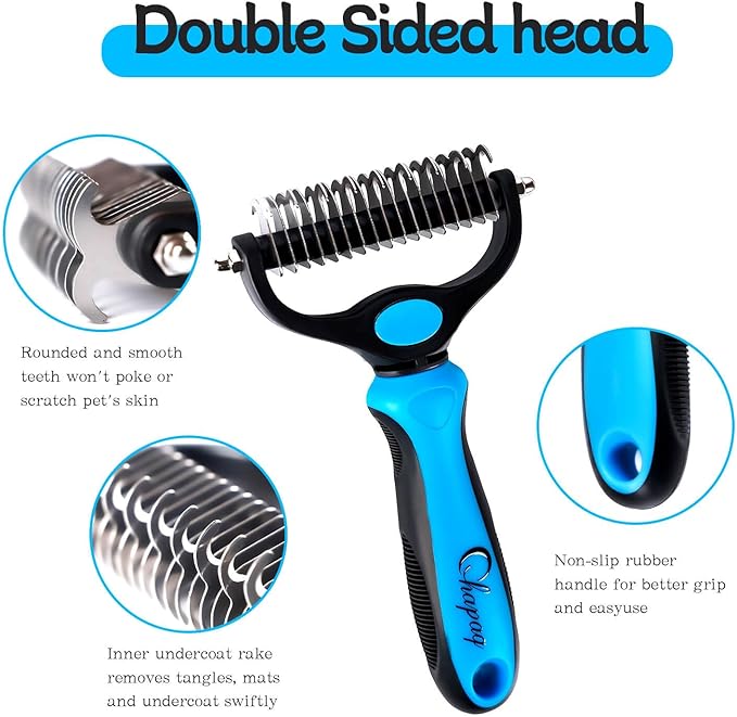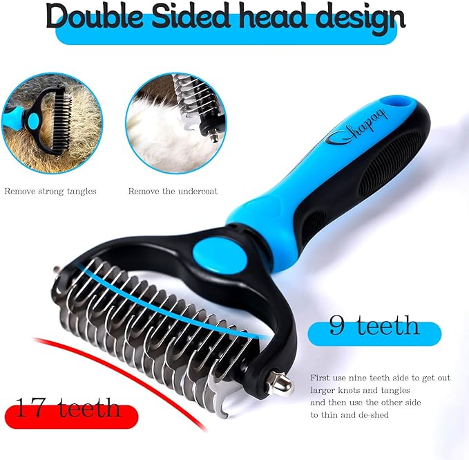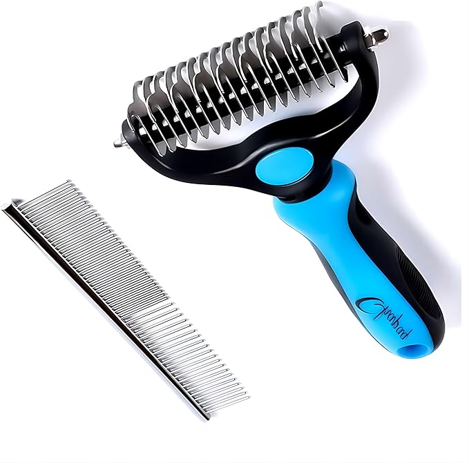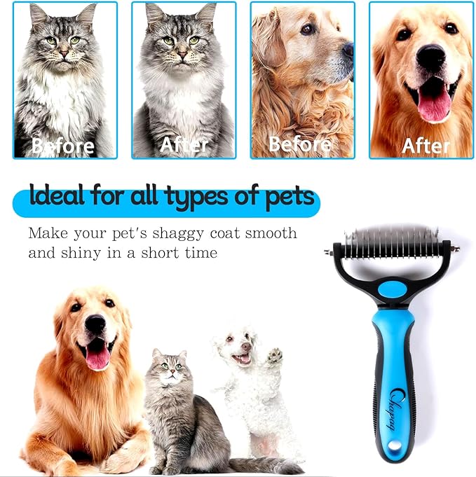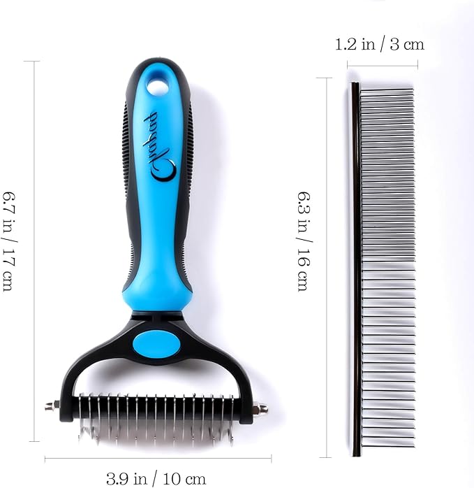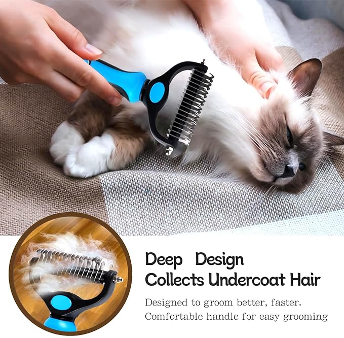 - Dog de-shedding tool. DESIGN】: High quality stainless steel metal teeth and compact design make our product sturdy and durable. High quality and lightweight TPR handles provide a comfortable non-slip grip and let you enjoy grooming your cat's comb. Double coated high quality dog under rake, cat grooming supplies, cat detangling comb, dog detangling comb.