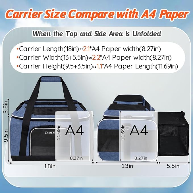 - 【AIRLINE APPROVED CARRIER 】Unfolded size:18"L×(13+5.5)"W×(9.5+3.5)"H, Petskd pet carrier is TSA approved and can be placed under the seat in the cabin, it is mainly designed for ①Southwest Airlines:18.5x13.5x9.5"②Allegiant Airlines:19x16x9", but also in compliance with ③Air Canada:21.5x15.5x10.5". We recommend you buy this carrier when you fly with the above-mentioned airlines. When you take the carrier on airplane, please fold the top and side expansion areas for the size of airline se
