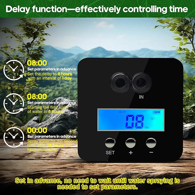 - 【Smart LED Display Reptile Humidifier with Timer】Only 3 Buttons to set up the reptile mister. Mode button-choose for a regular or automatic spray. Spray Duration-set up spraying time from 5s, 10s, 15-60s, so cycle. Stop Duration-set up stop time every spraying cycle, from 1h, 2h, 3h-24h, so cycle. Once the timer set, the settings are stored in the reptile fogger automatically. There is no need to reset the timer every time you restart the power to the device.LED Display, easy to read.
