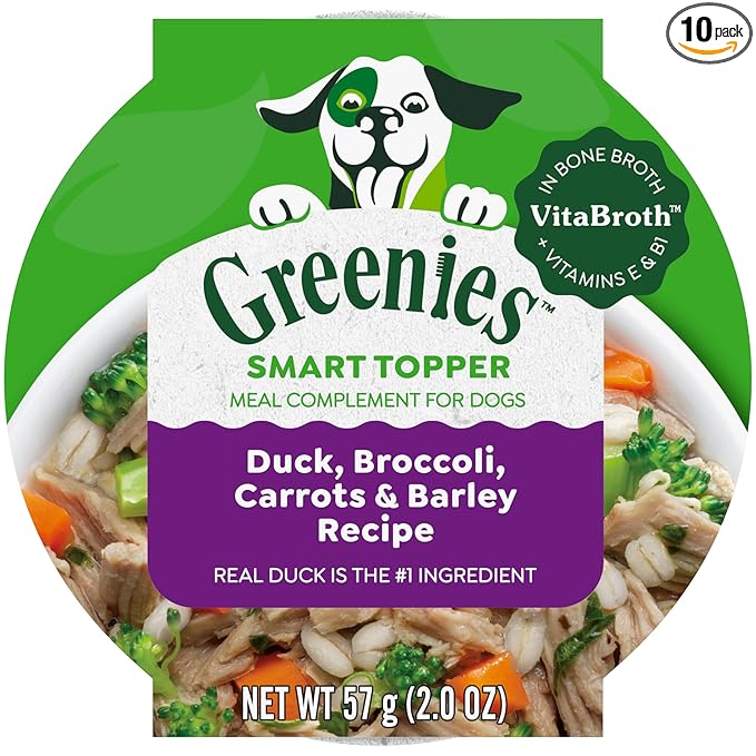- Contains ten (10) 2.0 oz trays of Greenies Smart Topper High Protein Wet Mix-In for Dogs, Duck, Broccoli, Carrots & Barley Recipe In Vitabroth Broth - Bone Broth + Vitamins E & B1.