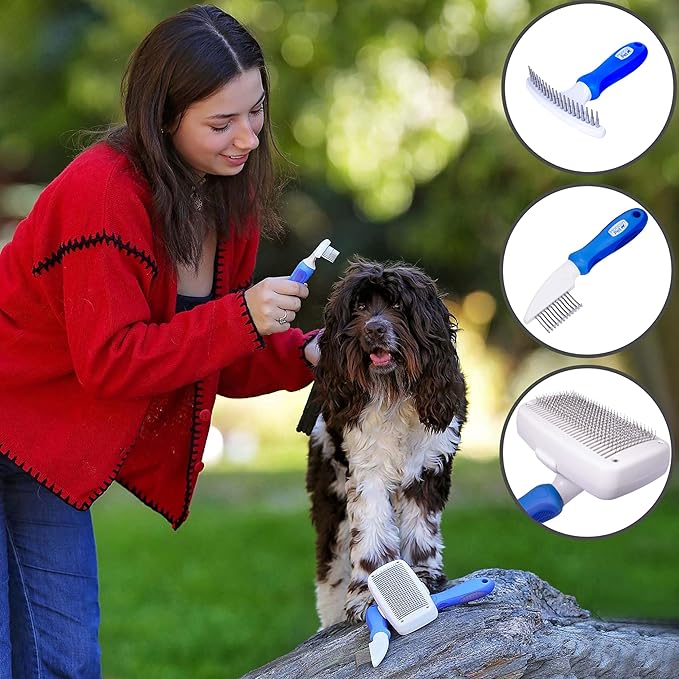 Self-Cleaning Slicker Brush for Dogs, Shedding Fur Comb, Dematting Comb & Nail Clipper Set for Dogs With Medium and Long Hair