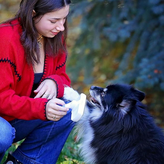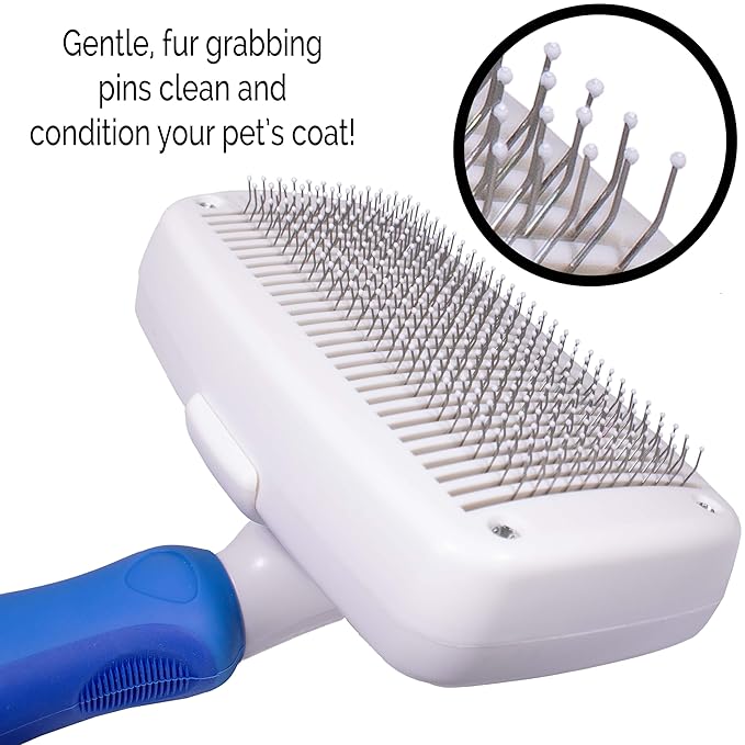 - The Self-Cleaning Slicker Brush with gentle plastic tipped nubs on the pins can then remove loose fur and undercoat while conditioning the coat by distributing your pet's natural oils through it's coat.