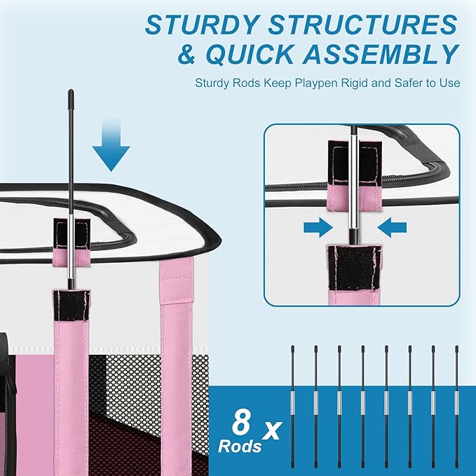 - 【No Assembly required】Opening the dog pen takes only a few seconds, is lightweight, strong, and does not require assembly. When not in use, it can be folded into the tote bag provided by us, which takes up minimal space and is easy to carry and store. Spacious interior Spaces allow your pet to play, sleep, hide or isolate. Perfect for indoors, lawns, beaches, parks, Tours, camping and more!