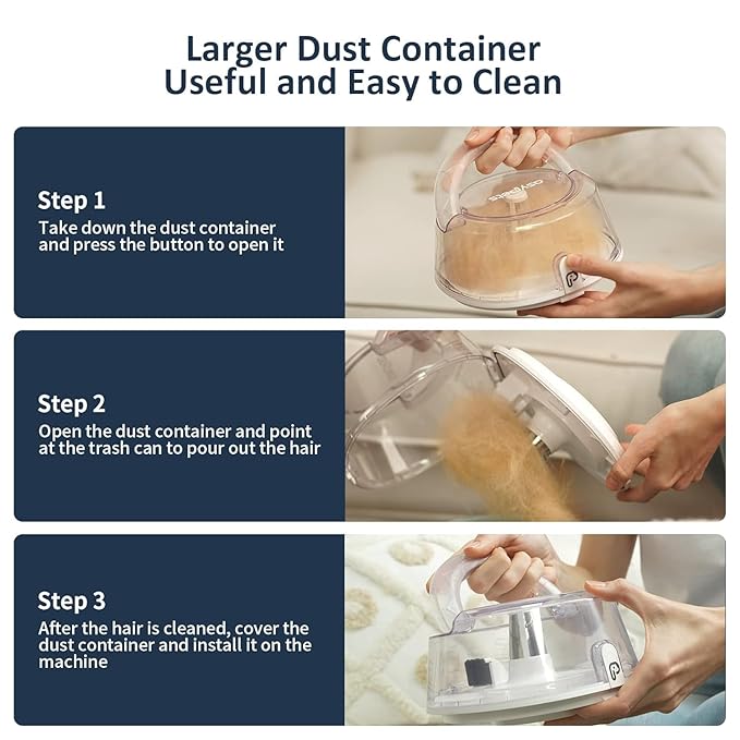 - 5 Major Upgrades --❶dog hair vacuum groomer adopts vertical air inlet cooperate with conical 360-degree air inlet metal mesh design, the filter will not be blocked;❷Now up to 11Kpa of suction power,Captures 99% of pet hair; ❸Detachable hair clipper, more convenient to use;❹Simple one-button operation of opening the cover, the process of pouring pet hair becomes very simple;❺Extended and detachable hose,in case of blockage,the hose can be detached for unclogging;