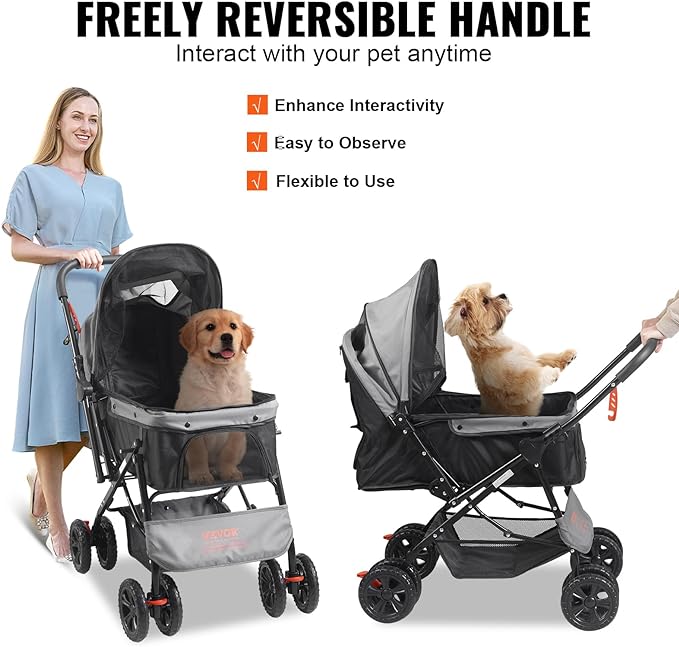 - Reversible Handlebar: Our puppy Jogging stroller allows for easy handle direction adjustment, enabling you to communicate face-to-face with your pet anytime, anywhere, and providing a more friendly experience for both you and your pet. The spacious storage basket ensures ample room for your pet to move comfortably.