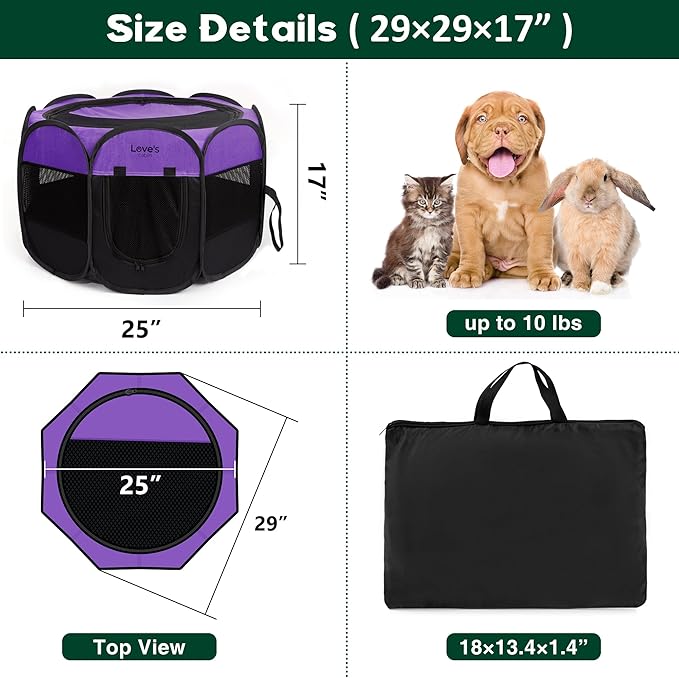 Love's Cabin Pet Puppy Playpen, Small Dog Tent Crate, Portable Foldable Dog Kennel with Carrying Case, Removable Zipper Top, Purple