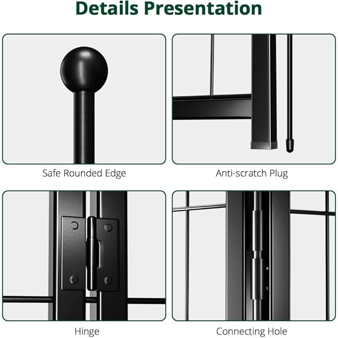 - Stable & Safe: The dog fence uses heavy metal with thickened iron tube for stability and anti-collapse. The metal surface is smooth, with no rough or sharp spots, and the metal stakes have rounded ball heads to avoid harm if the pet jump out of the fence