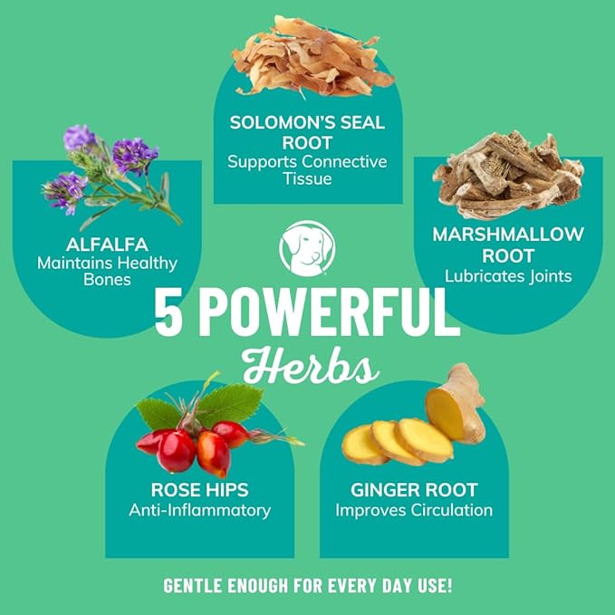 - IMPROVES JOINT HEALTH: Formulated by a top canine herbalist to serve as the ultimate hip and joint supplement. Packed with the goodness of collagen, naturally-occurring glucosamine and anti-inflammatory properties, this unique blend is designed to enhance joint health and improve your dog's mobility.