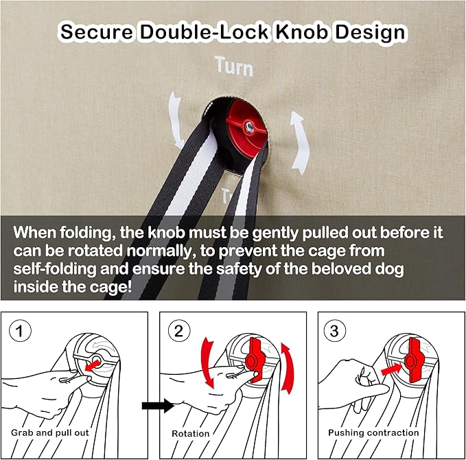 - Safety knob & Zipper & Leash: To ensure the safety of your beloved dog inside the crate, our knob is designed with a two-step locking mode. When folding, you need to gently pull it out before you can rotate it normally, to prevent the crate from suddenly folding. The safety leash inside our dog crate clips onto your dog's collar to ensure they stay safely inside it. It also comes with a heavy-duty self-buckling zipper for added security.