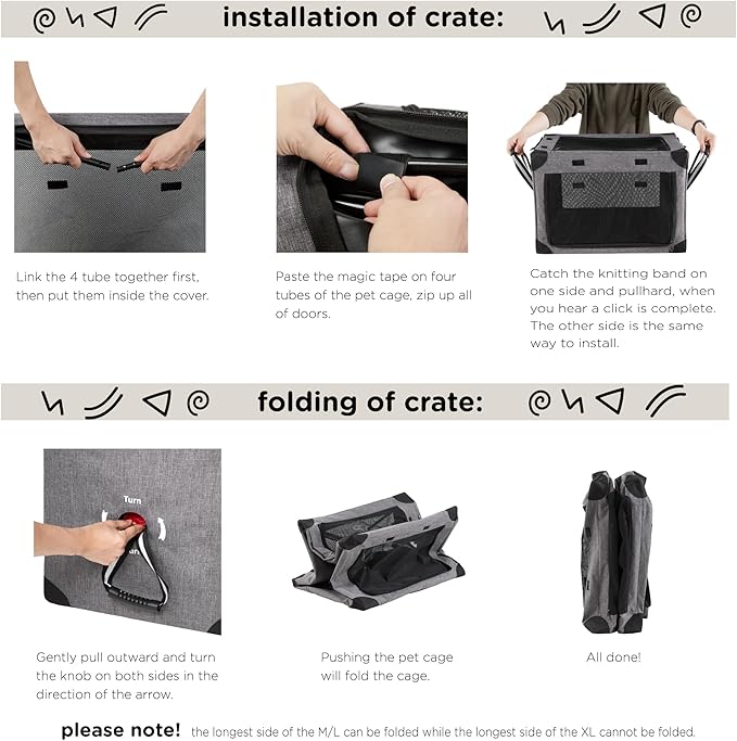 - M/L Size Installation: Tips: The dog crate installation for M/L size has one more step than XL: link the longest side. Please watch our provided installation video, which will assist you with your installation. When installing the M/L size dog cage for the first time, just connect the longest side once, from then on, it can be used the same way as the XL size.